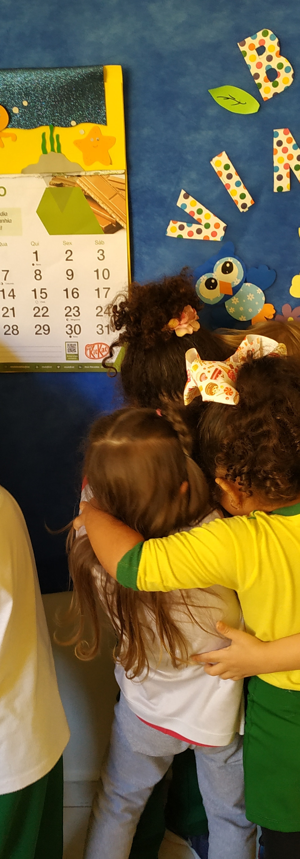 No dia 01/08/2019 iniciamos o segundo semestre de aula. Como professora estava ansiosa em receber a minha turma do Infantil II, do período tarde. Iniciamos nossas atividades pontualmente às 13:00, toda a proposta de trabalho para o dia, foi idealizado com muito carinho e amor. Desenvolvemos brincadeiras e dinâmicas diversificadas na sala de aula como o abraço amigo e o abraço coletivo.